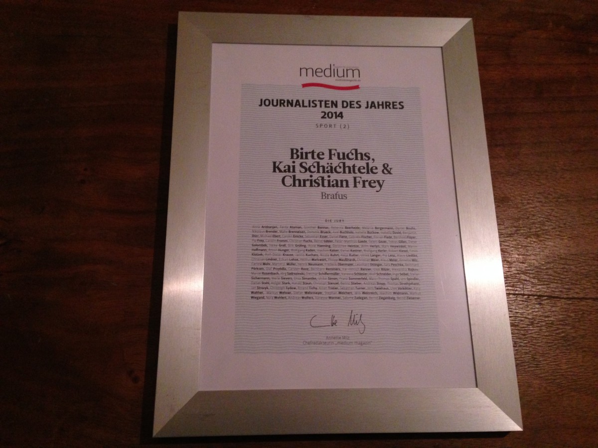 Bei der Wahl der Journalisten des Jahres, ausgerichtet vom Medium Magazin, wurde brafus2014 in der Kategorie Sport auf Platz 2 gewählt. Die Jury begründete das so: „Sie reisten auf eigenes Risiko nach Brasilien, um multimedial im Web über die Fußball-WM zu berichten. Das Team besetzte mit Brafus eine Leerstelle und brachte seinen Lesern Brasilien jenseits der Klischees nahe.“